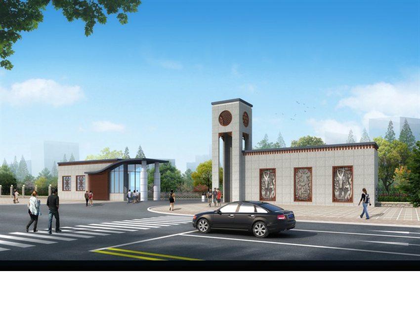 大門設(shè)計(jì)實(shí)現(xiàn)人流與車流分開(kāi),進(jìn)出分開(kāi),為使得管理方便,在拱內(nèi)兩個(gè)張開(kāi)的雙臂中,留有門衛(wèi)值勤房,值勤房在人流與車流之間,電動(dòng)伸縮門可以封閉人流與車流,設(shè)計(jì)功能合理。