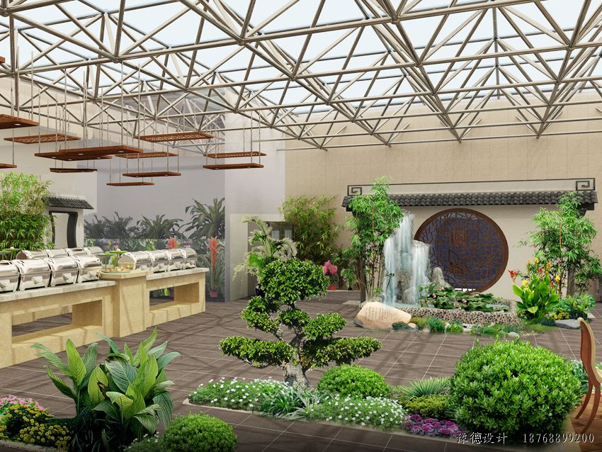 生態(tài)餐廳是綜合運用建筑學、園林學、設(shè)施園藝學、生態(tài)學等相關(guān)學科知識進行規(guī)劃、設(shè)計和建設(shè),以設(shè)施調(diào)控技術(shù)、農(nóng)藝栽培及管理技術(shù)來維護餐廳的優(yōu)美環(huán)境,形成以綠色景觀植物為主,蔬、果、花、草、藥為輔的植物配置格局,結(jié)合假山、瀑布、小橋流水、竹木亭閣等園林景觀,全方位立體展現(xiàn)綠色、優(yōu)美、宜人的就餐環(huán)境。